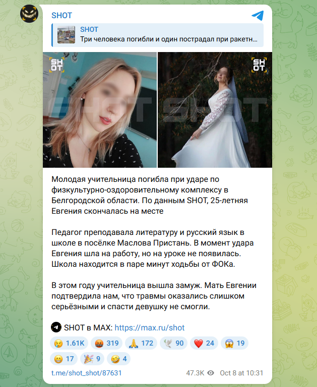 По данным канала SHOT, одной из троих погибших оказалась 25-летняя учительница литературы и русского языка. Молодая женщина шла на работу – в поселковую школу, когда её убили ВСУ.