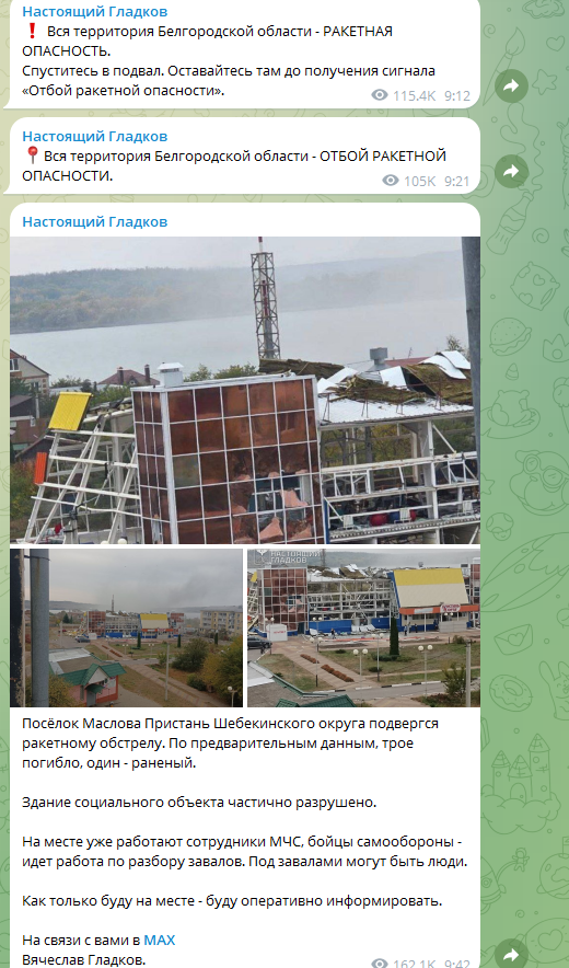 Позже стало известно, что украинцы били по гражданскому объекту – физкультурно-оздоровительному комплексу. Погибли трое гражданских, один ранен, сообщил губернатор Вячеслав Гладков.