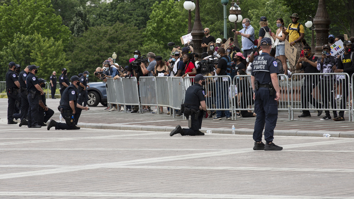 Фото: На заметку властям Ханты-Мансийского автономного округа — американские полицейские на коленях. Фото: Stefani Reinoldz/Globalllookpress