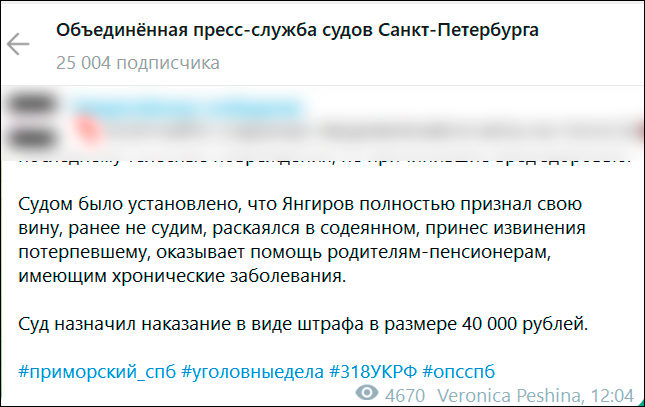 Скриншот с ТГ-канала "Объединённая пресс-служба судов Санкт-Петербурга"
