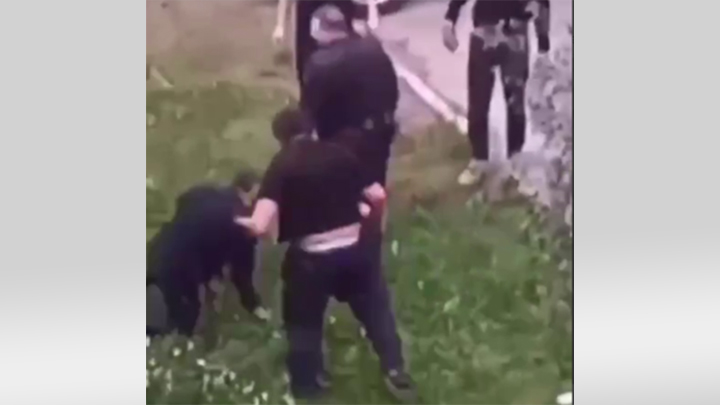 Бородатые "подростки" Нефтеюганска пинают "лежачего полицейского". Скриншот: соцсети