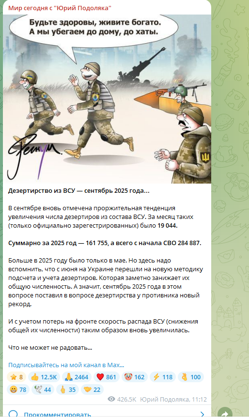 Поэтому при любом удобном случае несчастные новобранцы "тикают огородами". Как указал Юрий Подоляка, в сентябре из рядов ВСУ дезертировали 19 044 солдатика. Это только официальные подсчёты, на деле, конечно, количество наверняка больше.