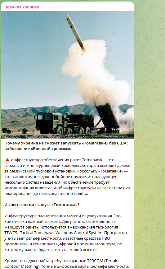 "Томагавк" – это строго американское оружие, которое требует постоянной поддержки со стороны американской же глобальной сети разведки, планирования и связи, чтобы обеспечить его высокую точность и гибкость применения. Следовательно, даже если США передадут наземные пусковые установки и сами ракеты "Томагавк" Украине (как, например, заявлялось про передачу ЗРК Patriot), вся критическая инфраструктура (которую по важности и сложности сравнивают с ядерным оружием) всё равно останется под контролем США. И ни одна другая страна, кроме США, не будет решать, как и куда запускать эти ракеты,