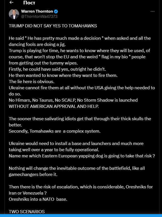 Это означает одно: США напрямую входят в войну с Россией. Именно поэтому, пишет британский журналист Уоррен Торнтон на своей странице в соцсети, Трамп не собирается делиться "Томагавками" с Киевом.