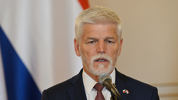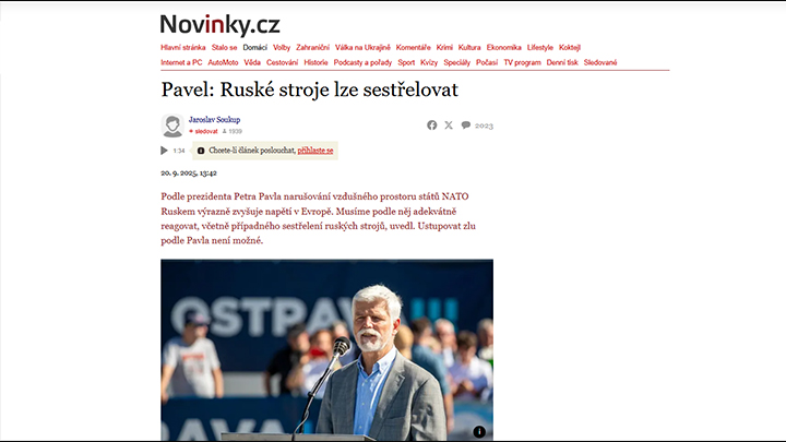 "Россия будет вести себя так, как мы бы ей позволили. Российские самолёты можно сбивать", — вещает Петр Павел. Скриншот: Novinky.cz