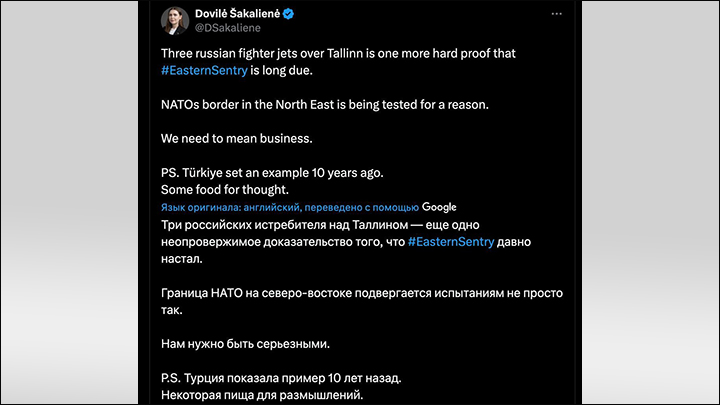 Три российских истребителя над Таллином — ещё одно твёрдое доказательство того, что инициатива "Восточный страж" давно назрела. Северо-восточная граница НАТО проверяется не просто так. Мы должны действовать всерьёз. Турция показала пример 10 лет назад. Есть над чем задуматься.