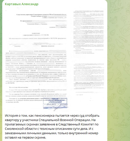 Дмитрий подал заявление в Следственный комитет по статье "Мошенничество". И в рамках уже этого процесса будем выяснять истину, благо фактуры для рассмотрения много. Заявление подано представителем Дмитрия лично в Смоленский СК 06.11.2025. Также в органы предварительного следствия предоставлены документы, подтверждающие правомерность сделки и добросовестность покупателя. Ну и попутно я само заявление выкладываю в сети Интернет. С надеждой на то, что широкий общественный резонанс ускорит рассмотрение дела по существу,
