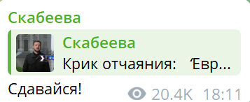 Телеведущая Ольга Скабеева напрямую обратилась к Зеленскому после его очередного видео. Она сказала лишь одно слово: "Сдавайся!"
