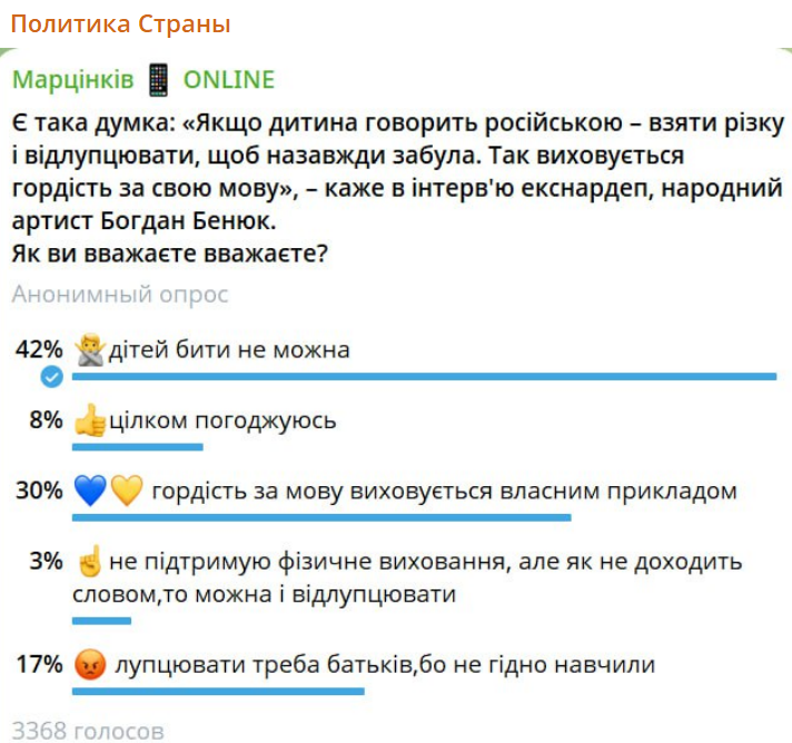 А 17% пользователей заявили, что "лупцевать надо родителей", чтобы те научили своих детей "правильному" языку. И лишь 3% поддержали инициативу Бенюка.