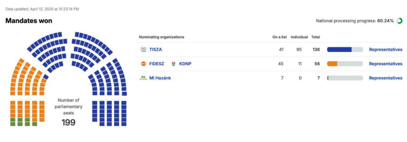 По мере подсчёта голосов в информационное пространство начали поступать ещё более громкие оценки: сообщалось, что "Тиса" может получить до 136 мест и сформировать конституционное большинство. В ряде сообщений утверждалось, что лидер партии Петер Мадьяр уже получил поздравления от Орбана. Если такие результаты подтвердятся, это действительно станет тяжёлым поражением для действующей власти.