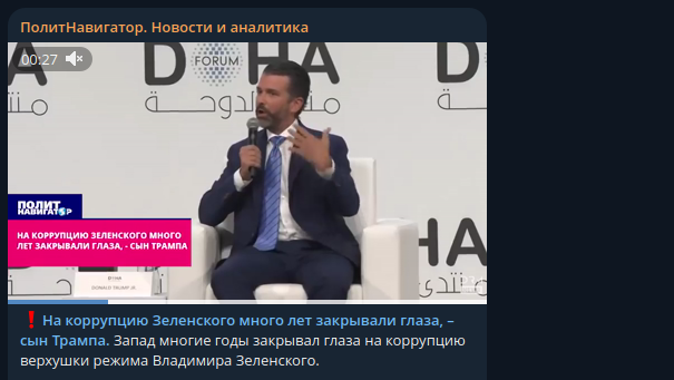 Публичный образ Украины на Западе - это история о героическом сопротивлении и единстве нации. Однако выступление Дональда Трампа-младшего в Дохе предложило аудитории совершенно иную, куда более мрачную картину. Сын американского лидера констатировал, что украинские власти не заинтересованы в мире, пока могут воровать. Кроме того, в ходе своего выступления наследник миллиардера сказал кое-что странное.