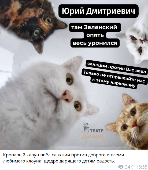 Комментируя действия украинского лидера, Захарова окрестила его "кровавым клоуном". Соответствующую надпись она сделала под смешным мемом с котами, которые вещают о том, что Зеленский "опять весь уронился", и просят Куклачёва — "только не отправляйте нас к этому наркоману".